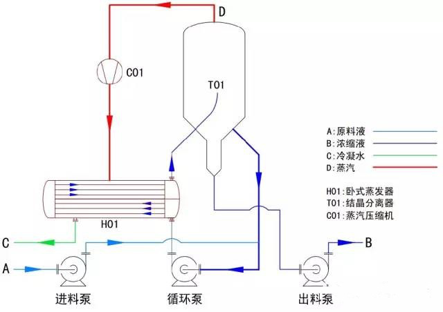 晶漿從循環(huán)管路中用出料泵輸出。蒸發(fā)分離器內(nèi)的二次蒸汽經(jīng)過蒸發(fā)分離器上部的分離和除沫裝置凈化后輸送到壓縮機(jī),壓縮機(jī)把二次蒸汽壓縮后輸送到換熱器殼程用作蒸發(fā)器加熱蒸汽,實(shí)現(xiàn)熱能循環(huán)連續(xù)蒸發(fā)。